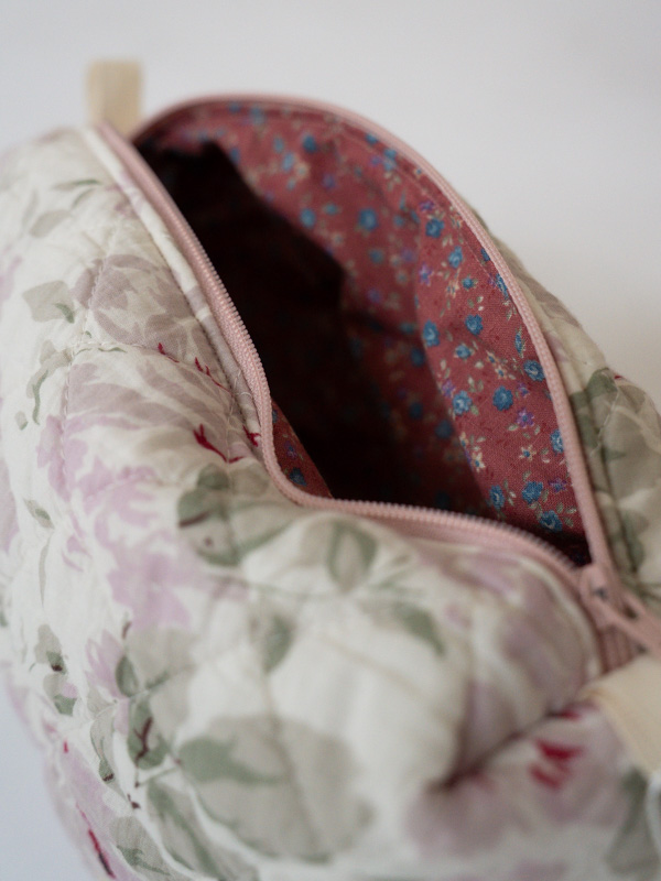 This ForFreida handmade makeup bag in a sage green and pink antique floral pattern is a timeless, one-of-a-kind accessory thoughtfully crafted for beauty, function, and sustainability. Made entirely by hand using sustainable materials, this bag features a softly quilted exterior with a romantic antique-inspired floral print, paired with a coordinating interior pattern that adds depth and charm. Each ForFreida piece is individually made, ensuring no two bags are exactly alike.