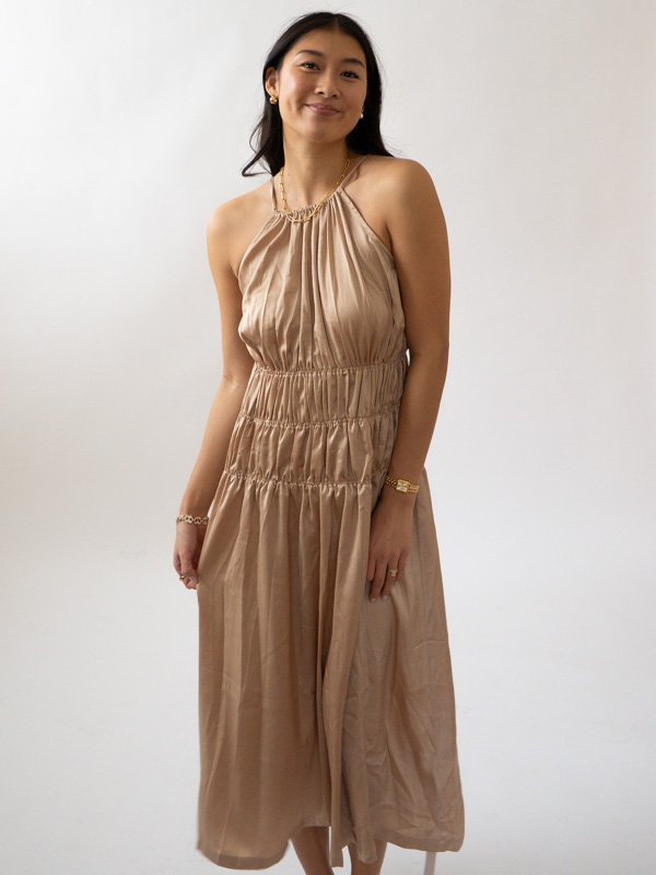 This Refound boutique dress is a beautifully curated second-hand piece designed for timeless, feminine wear. Featuring a soft halter-style neckline with delicate gathering and a smocked waist, this dress creates a flattering silhouette that flows effortlessly. The warm neutral tone adds understated elegance, making it a versatile choice for special occasions or elevated everyday styling.