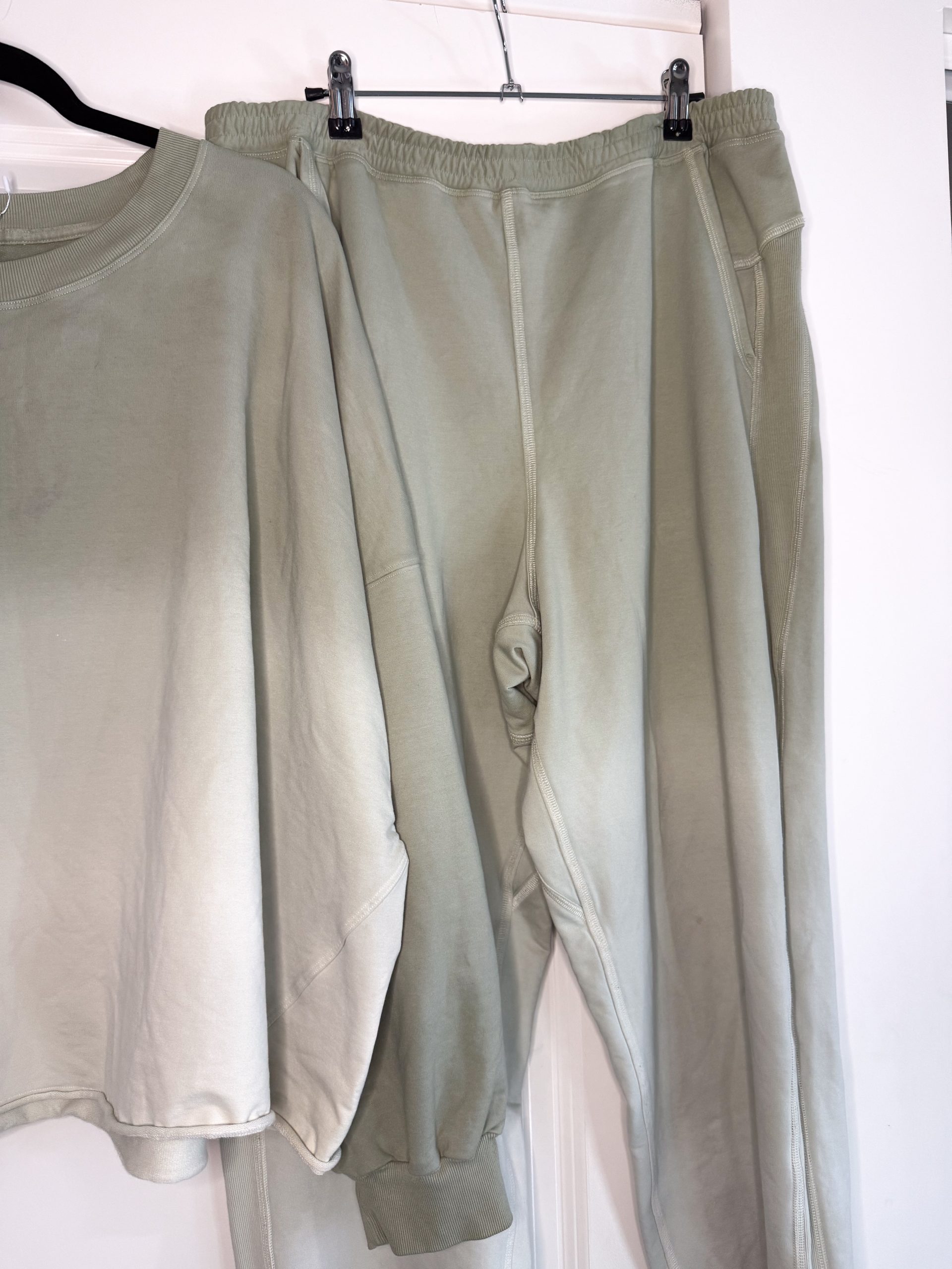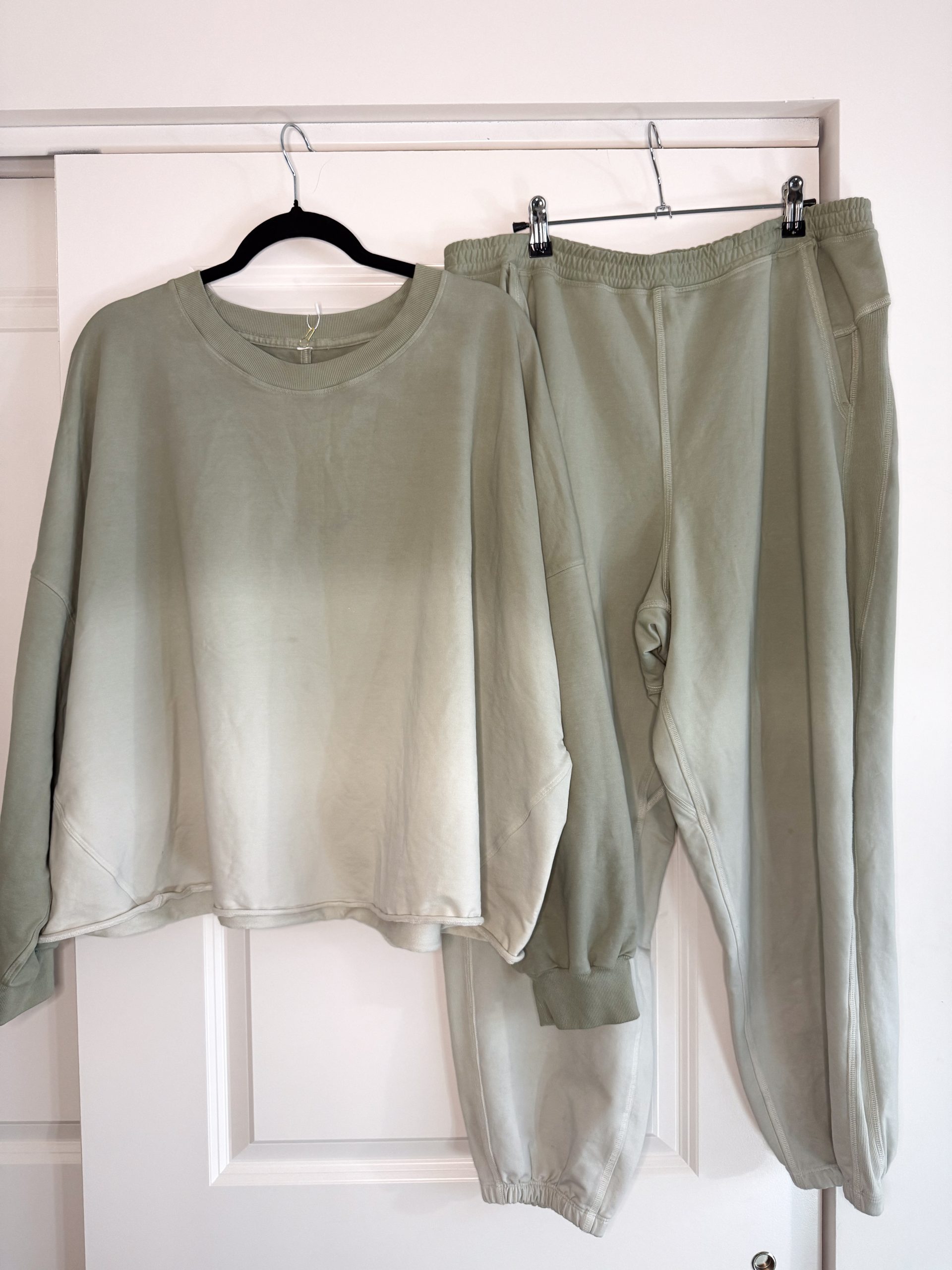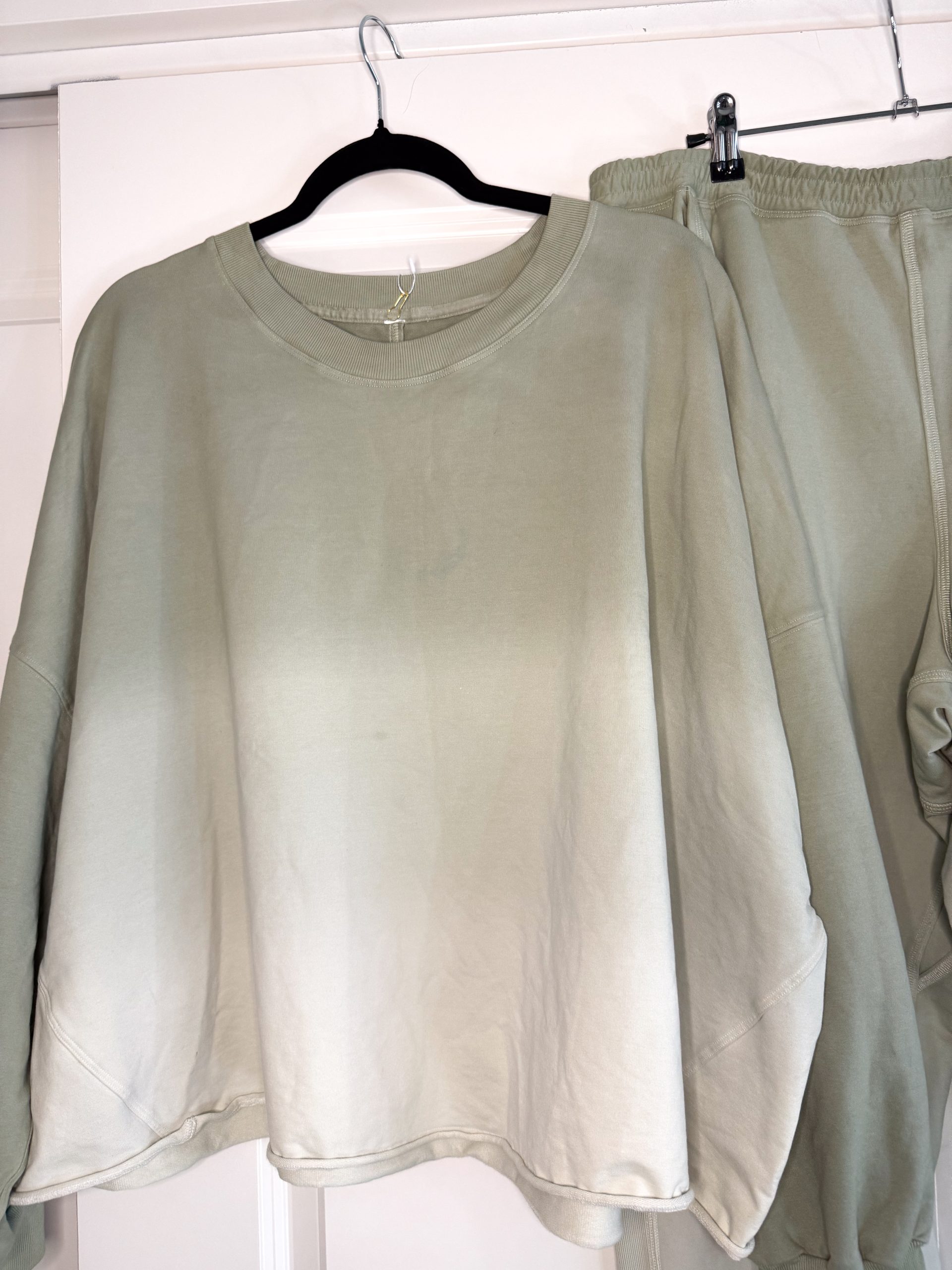 This Refound Lululemon sage green ombré matching set is a soft, elevated second-hand athleisure staple designed for effortless comfort and everyday wear. Featuring a relaxed crewneck sweatshirt paired with coordinating jogger sweatpants, this set showcases a subtle ombré fade that transitions beautifully through tonal shades of sage green. The result is a calm, neutral look that feels modern, cozy, and intentionally styled.