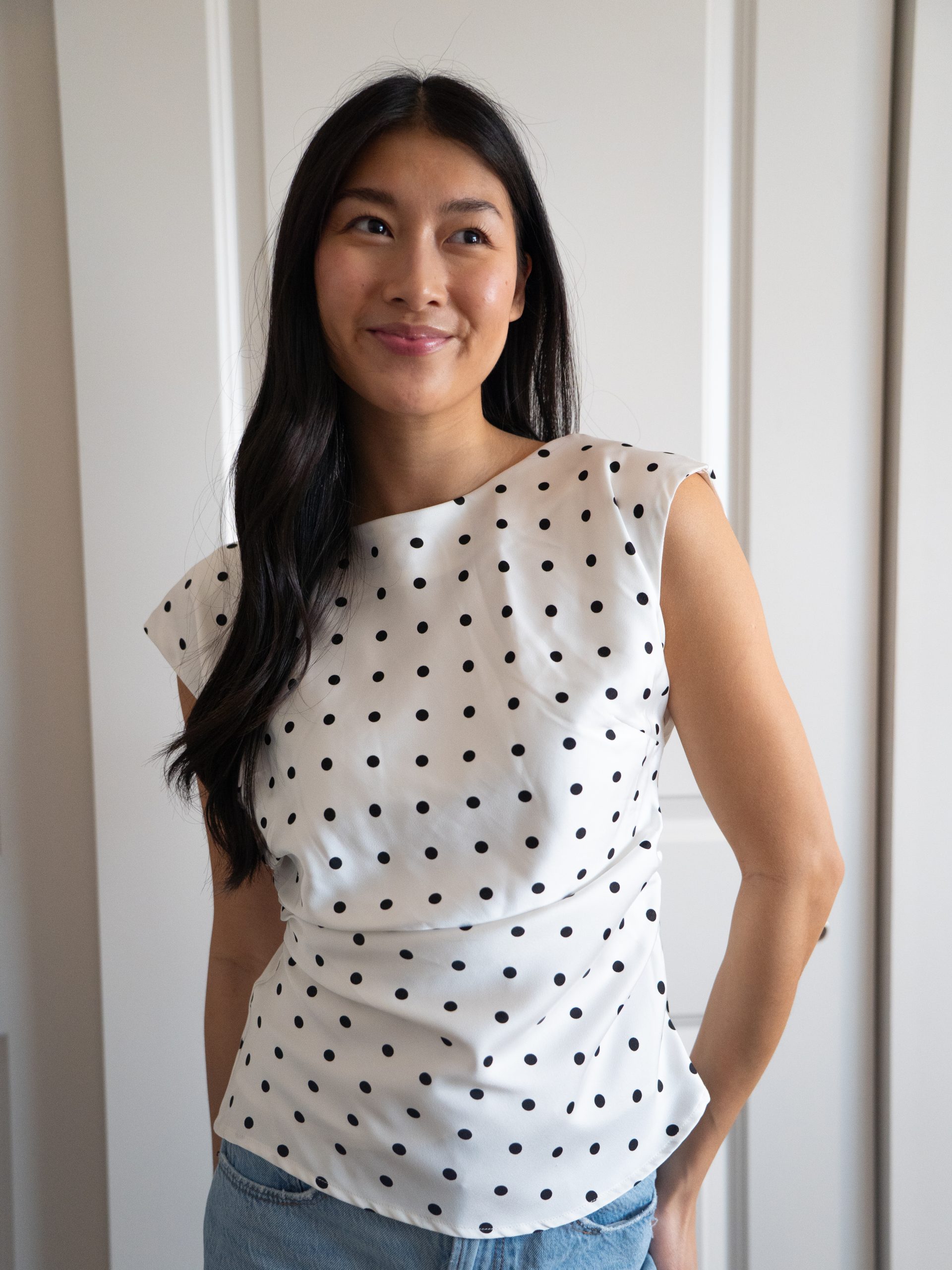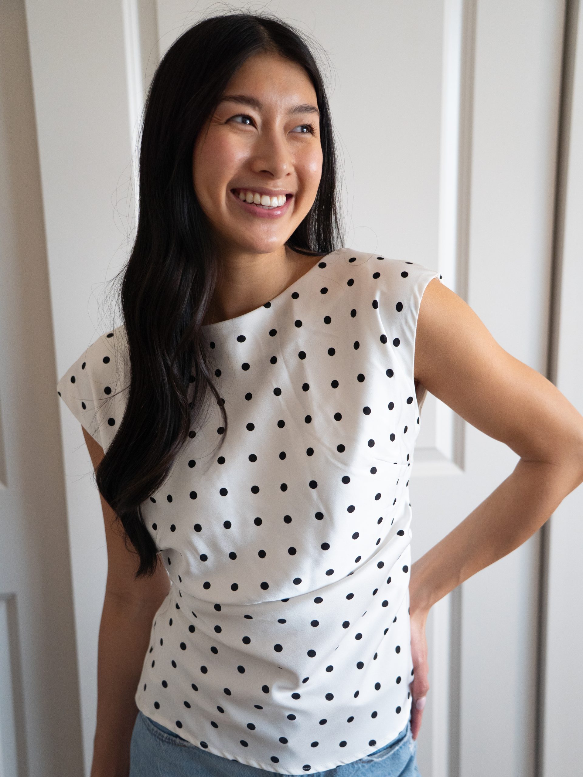 Timeless, feminine, and effortlessly polished—the Sloan Polka Dot Satin Boat Neck Top is the perfect piece for creating chic, elevated outfits.